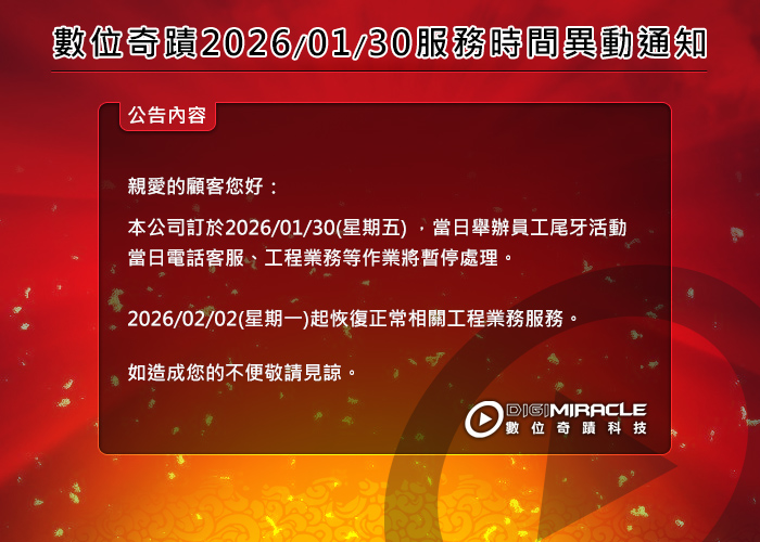 | 數位奇蹟2026/01/30服務時間異動通知!! | 2026.01.28 |