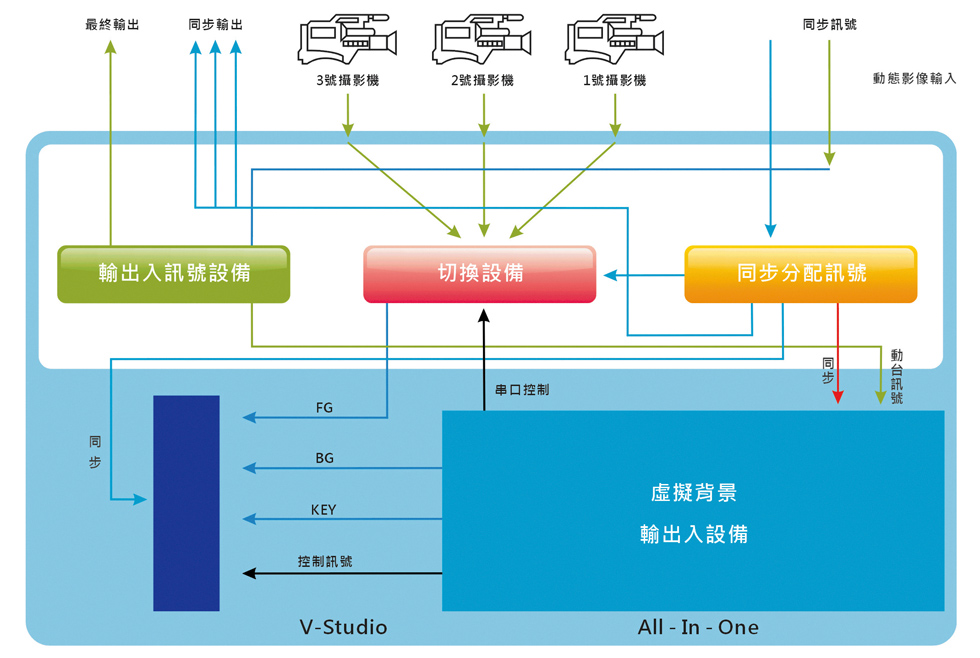 V-Studio 系統是 3D 虛擬佈景系統,即:系統中包含傳動感應追蹤系統;廣播系統根據傳動感應參數通過高速圖形加速系統產生背景圖像;最後前後景即時地合成並輸出。