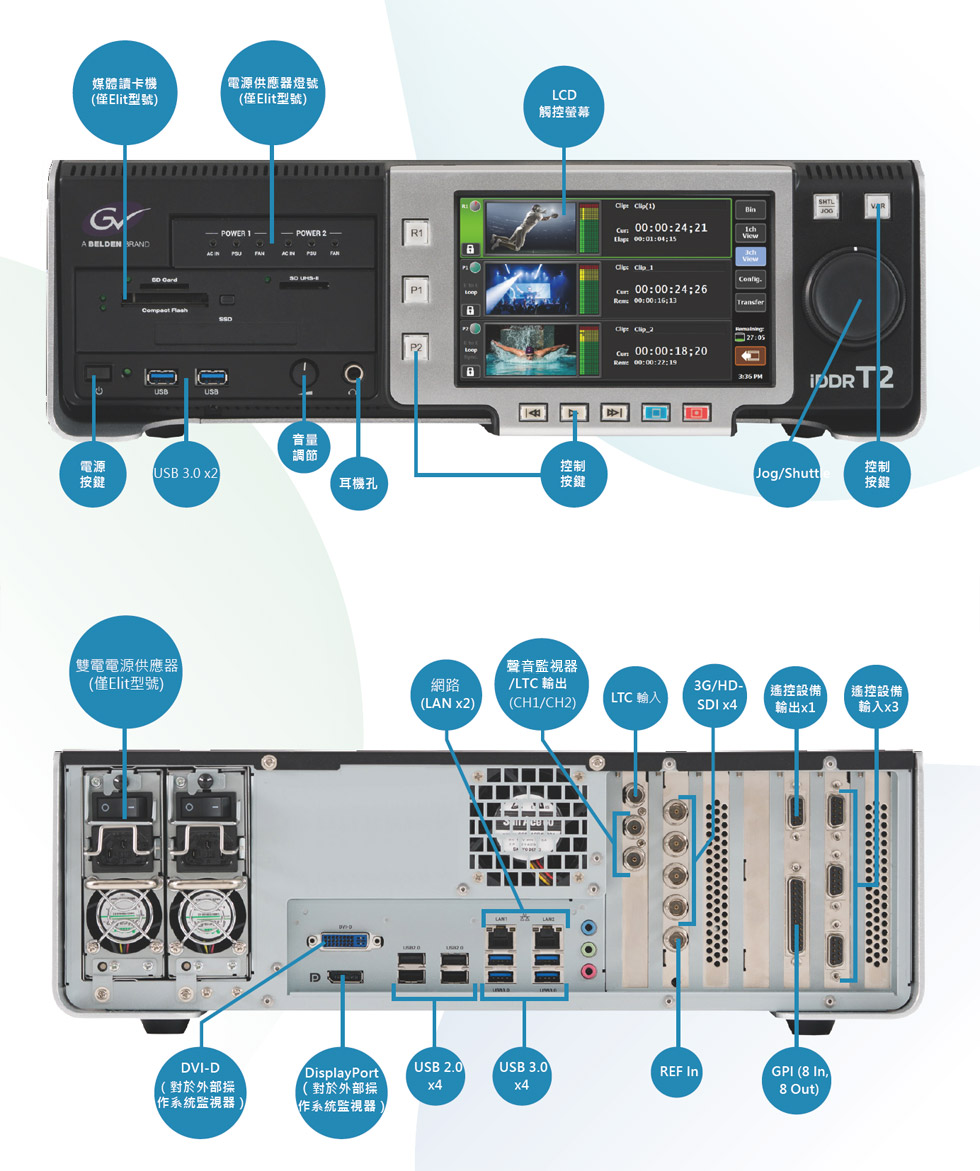 前面板清晰的液晶顯示器可以顯示高品質的圖像,並輔助軟件應用程序套件,用於管理和選擇媒體素材、素材編輯和修剪以及播放(包括創建播放列表)。T2 4K 具有後面板影像/聲音/遠端/LTC 連接功能,還可以通過 USB 3.0 接收文件,或通過標準千兆乙太網網絡傳輸數據,包括 Grass Valley HQX、XAVC、XAVCS、XDCAM、P2、AVC- ULTRA、Apple ProRes 422、Avid DNxHR、Avid DNxHD 、 MPEG-2 文件。此外,T2 4K 數位錄影機/播放器可以由影像製作切換器、演示混音器和聲音混音器控制,以創建強大的演示系統。